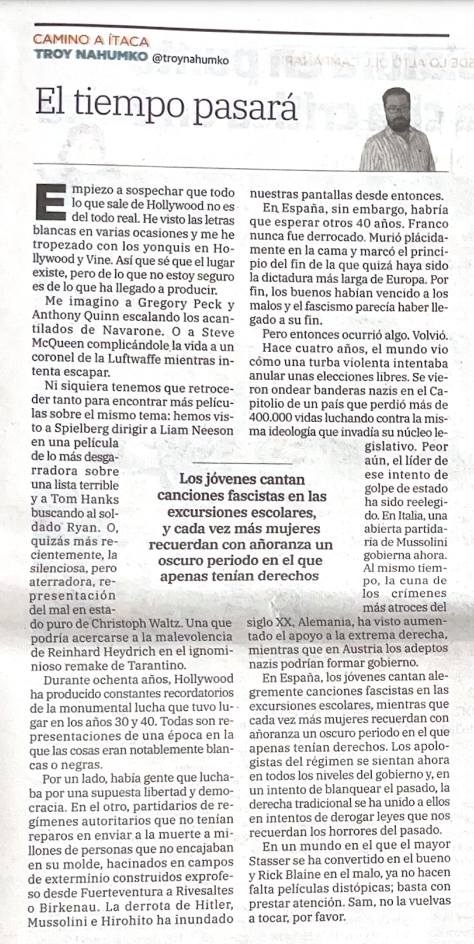 With just days before the freely elected orange Himler assumes the most powerful office on earth to disassemble the world order from inside, the Camino a Ítaca takes a look back at how eight decades of anti-Nazi propaganda on the silver screen have proven to be no match for the masses of disinformation fed to all through their tiny screens. What was once bad is now good and what was once evil is now accepted. The hundreds of thousands who lost their lives fighting these extreme righ-wing ideals now sleep uneasily as the very real threat of fascism returns. This time not by violence and force, but mire insidiously by fake news and misinformation. Click over to read the published versions both in Spanish in the HOY and in English in the SUR in English. (castellano abajo)